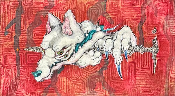 墨汁、顔彩、ペン、アクリル、胡粉ジェッソ/水彩紙 木製パネル