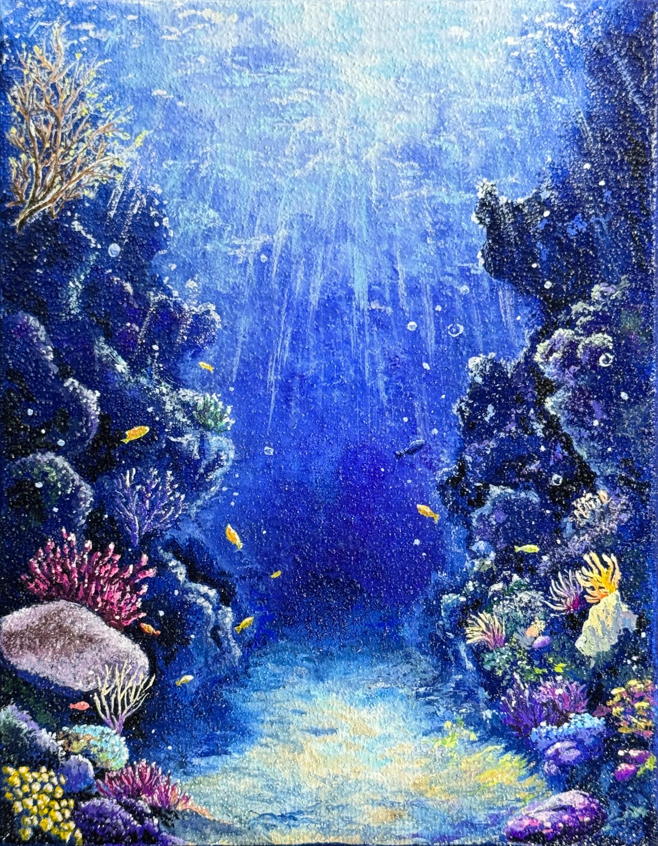 私の好きなモチーフである深海をベースに『自分と向き合う時間』をテーマに描きました。ゆっくり静かに流れる海を見ていると、小さな生物がコポコポと音を立てているような気がします。まるで自分の心の中を覗いているような気持ちになるのではないでしょうか。