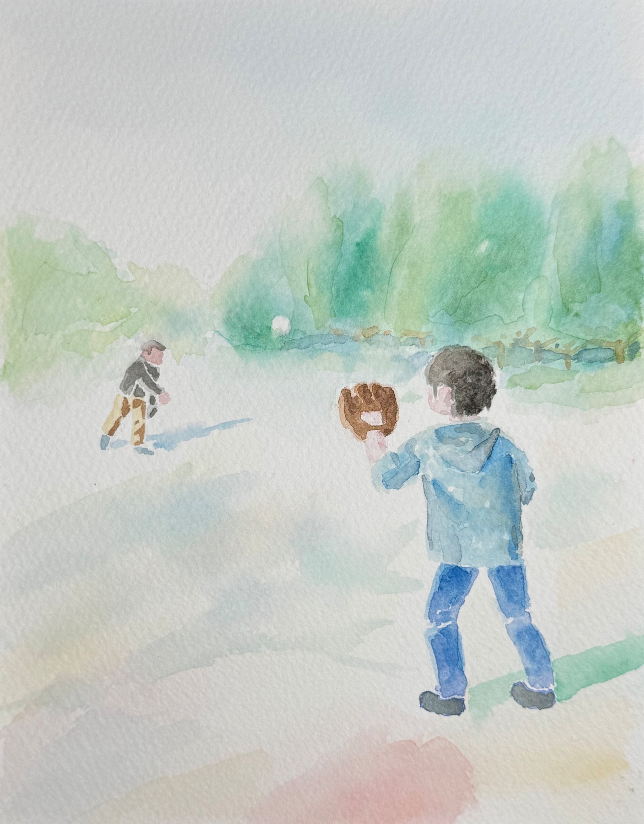 私が父と子を見守る視点で描きました。過去から未来へとつながる想いと、三世代が共にいられる平和への感謝を込めました。
